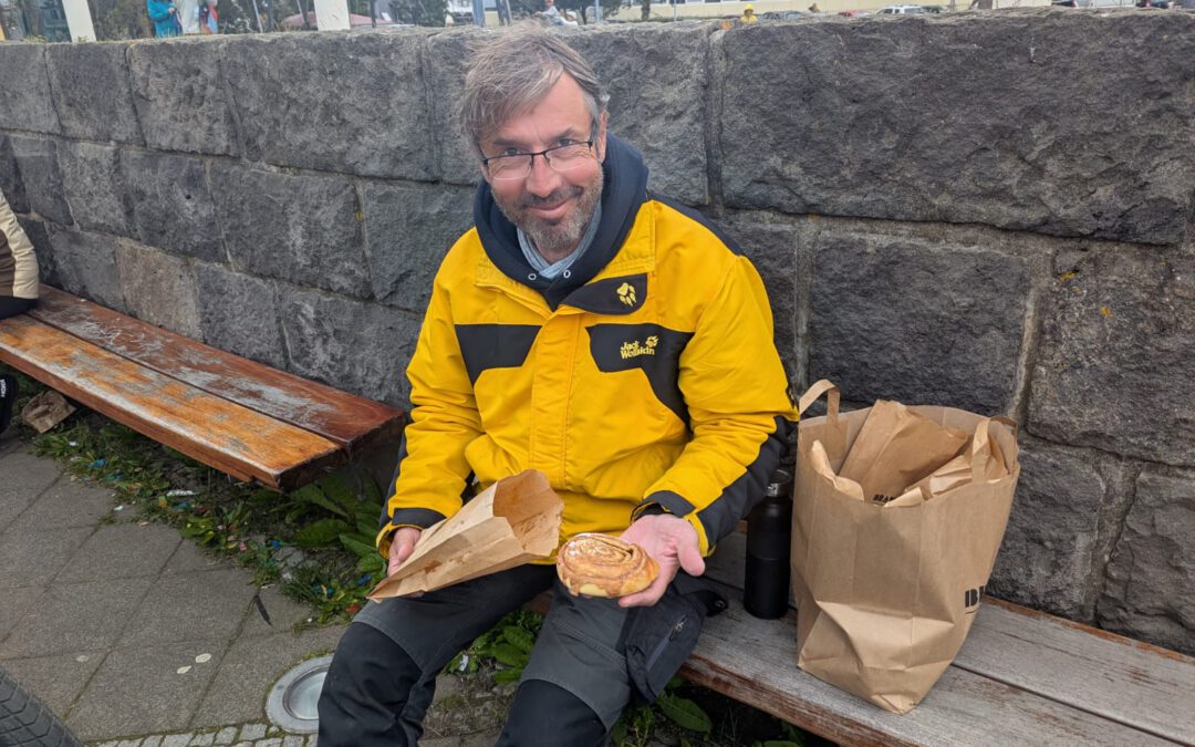 The next morning, nothing could hold Jürgen back – he had to go to Braud & Co.! Barely on his feet, he dashed off to the bakery, and even from afar, the aroma of freshly baked bread, sweet pastries, and cinnamon rolls filled the air. With bags overflowing, we sat down at the foot of Hallgrímskirkja, savoring the warm cinnamon rolls, and Jürgen could barely hold back his tears: He was incredibly grateful that he had made it all the way to Reykjavík, that he was able to experience this moment, and that his willpower had carried him right here.